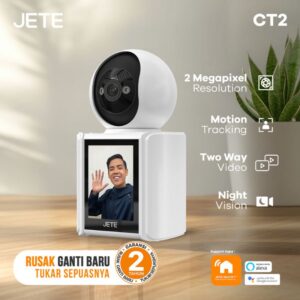 JETE CT2 Series menghadirkan kombinasi pengawasan dan komunikasi dalam satu perangkat. Kamera ini memiliki resolusi Full HD (2 MP) dengan layar IPS LCD 2,8 inci, memungkinkan melakukan video call dua arah langsung dari kamera ke smartphone—cukup tekan tombol khusus di perangkat, tanpa perlu membuka aplikasi di rumah . Desainnya kompak (85,7 × 79,9 × 162,2 mm, berat 0,4 kg) menjadikannya mudah ditempatkan di berbagai sudut ruangan.