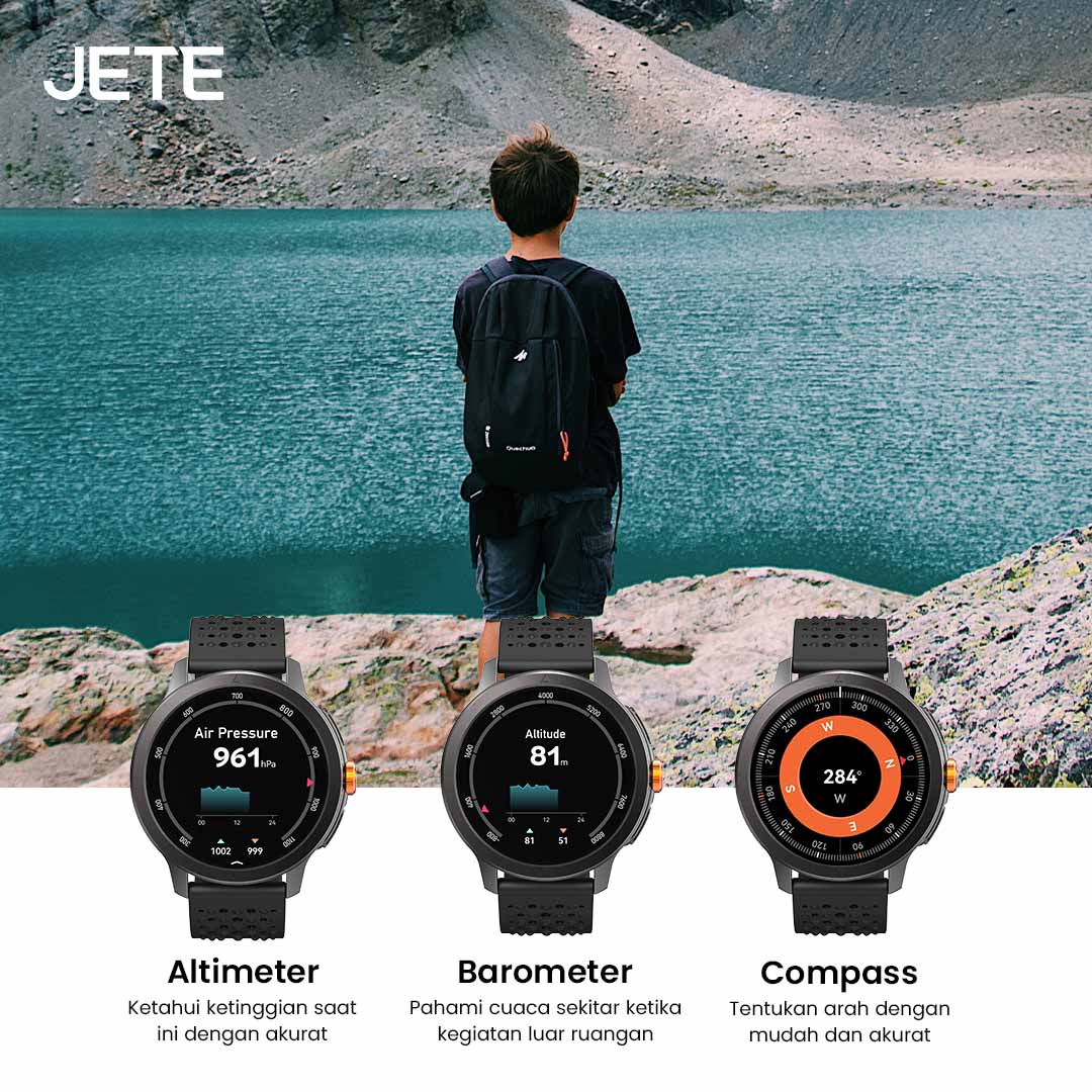 JETE VOLT 2 dibekali dengan tiga fitur navigasi, menjadikan aktivitas outdoor semakin aman dan nyaman. Mulai dari altimeter untuk mengetahui ketinggian, barometer untuk melihat tekanan udara dan kondisi cuaca, serta kompas digital yang membantu dalam menentukan arah secara akurat.
